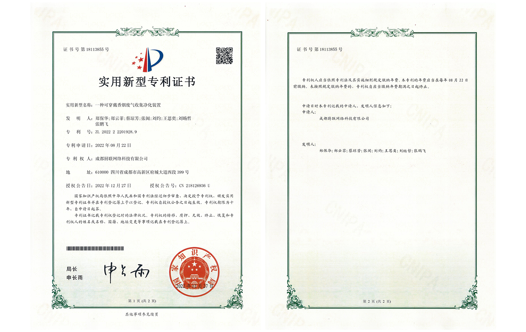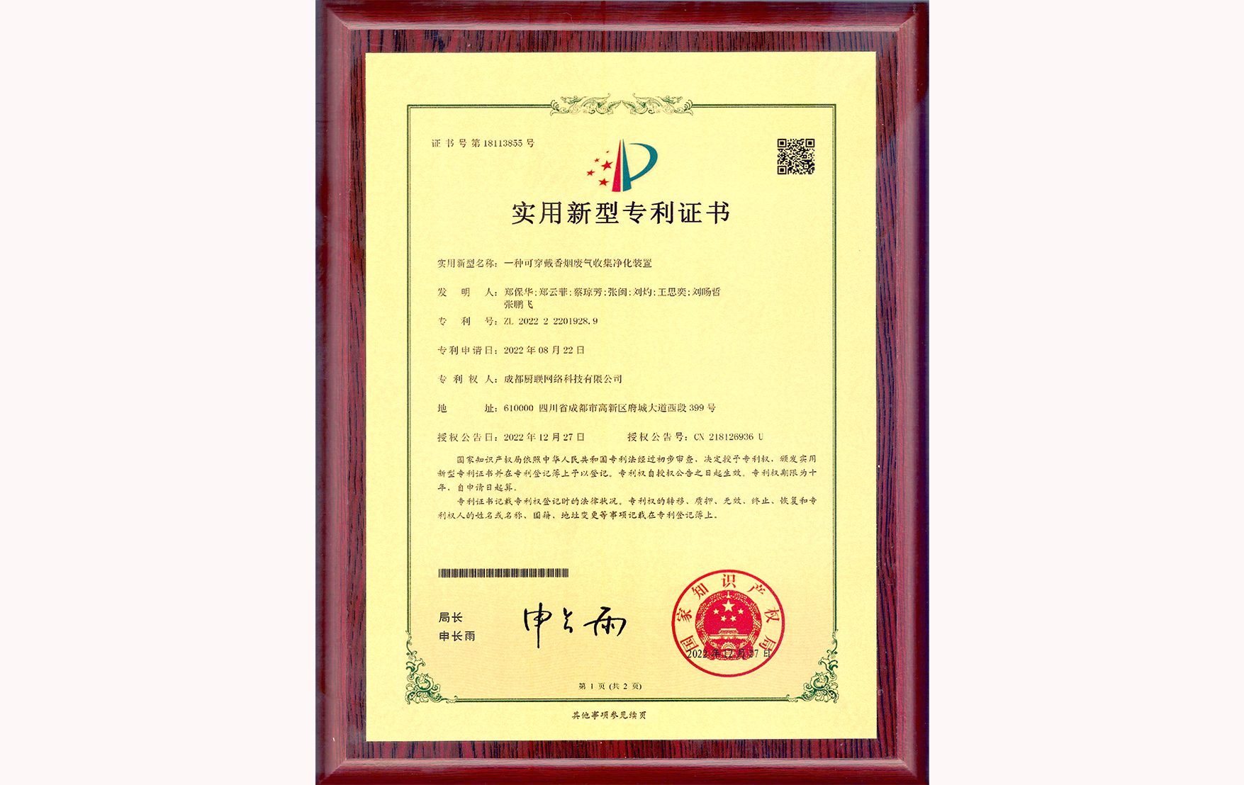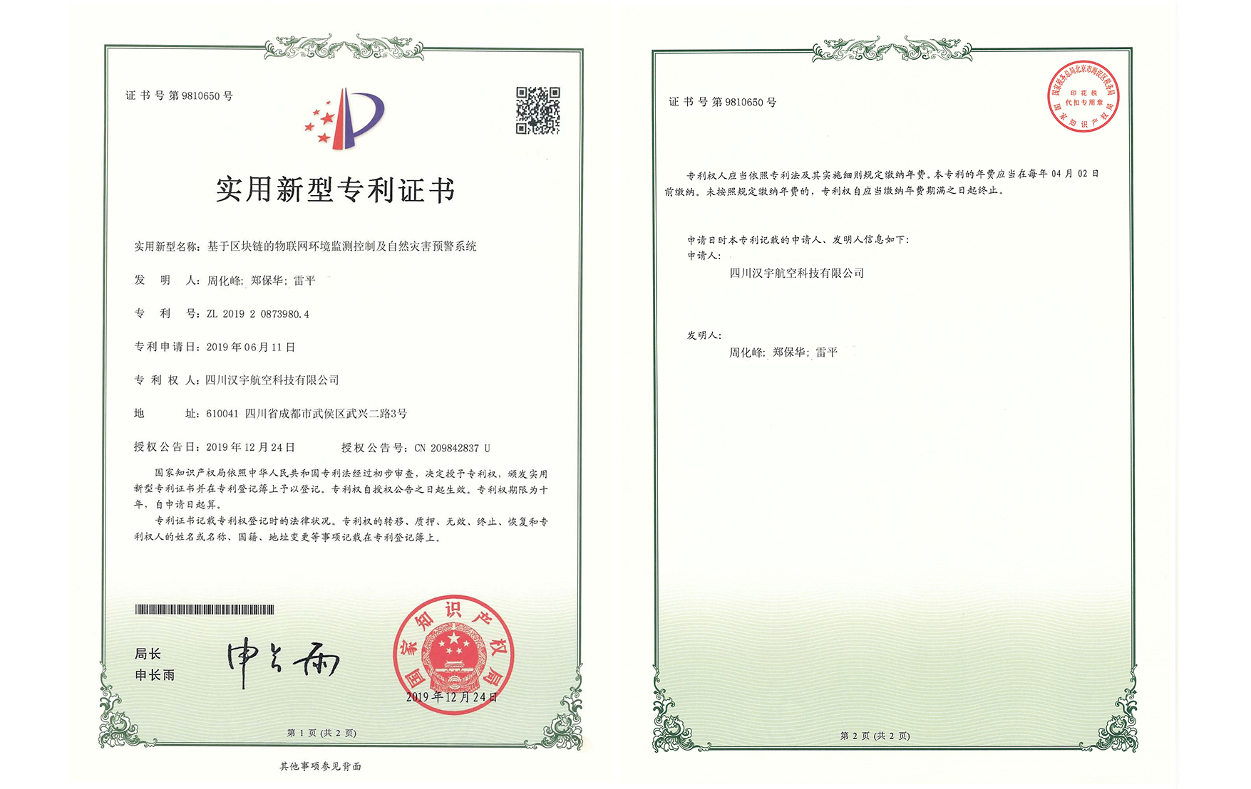 国家知识产权局 专利证 2021年 2022年 帮助专利 合作专利 关心下一代